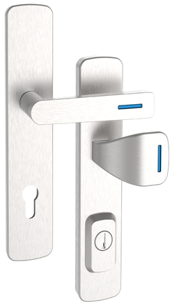 - Rostex RX1 Astra RC3 Sicherheitsbeschlag, Edelstahl matt, Luminoblau, Bologna-Griff – Quadratischer Griff